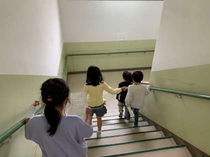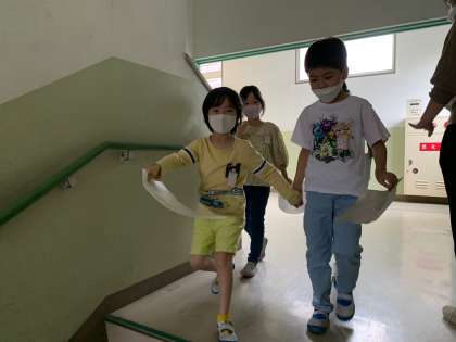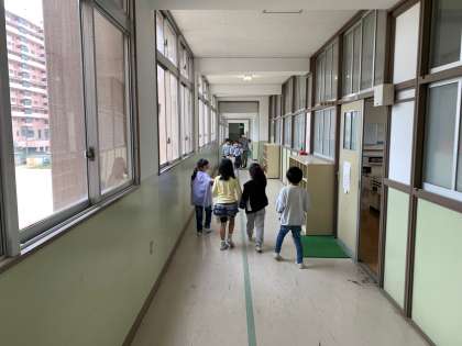 たんけんちゅう。2 2年生が優しく手をつないで案内しています。