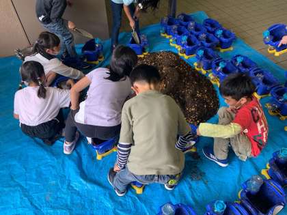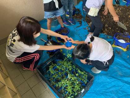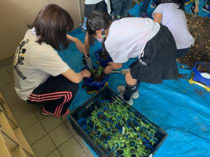 遠足が出発直前に延期になり、みんな落胆していたのですが、気持ちを切り替えて学習です。生活科の学習で、ミニトマトの苗を一人ひとり鉢に植えました。これから毎日水やりをして育てていきます。
