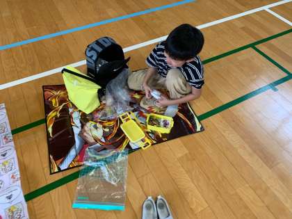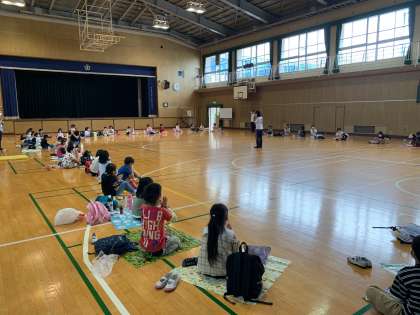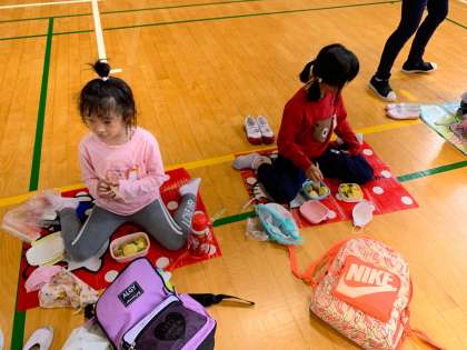 1・2年生は、今日の遠足が延期になったので、お弁当は、講堂で一緒に食べました。