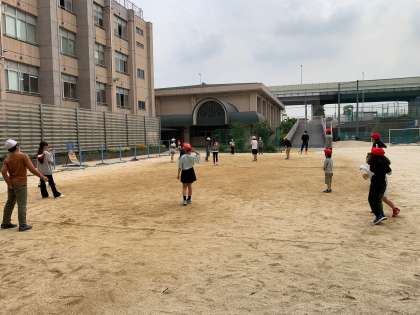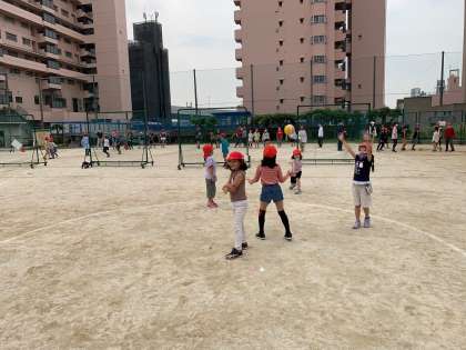 上の写真は、わくわくグループの遊びの横で、異学年で楽しくドッジボール。わくわくグループの活動を継続して行うことで異学年での遊びがふつうになっています。
