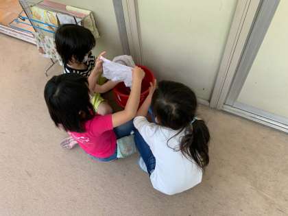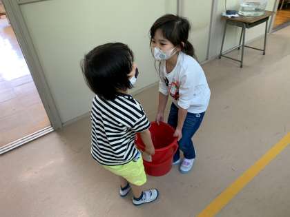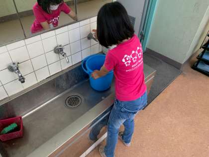 バケツの水でぞうきんを洗い、しぼります。そして、最後は協力して水を入れかえます。すべて自分たちでできるようになりました。
