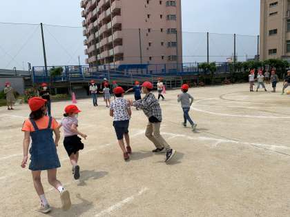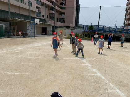 今日は、ピンクと黄チームの遊びです。待ちきれなかった子どもが運動場に飛び出してきました。