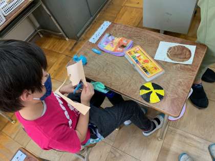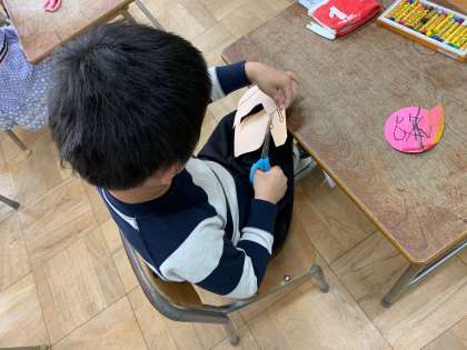 はさみをつかい、ていねいにきります。テープもつかいます。