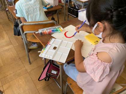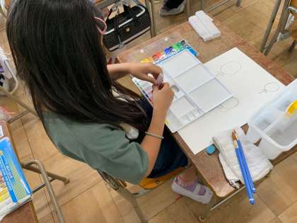 絵の具の使います。水入れの使い方など丁寧に指導していきます。