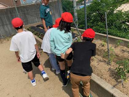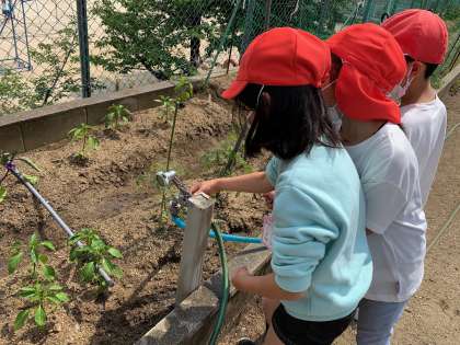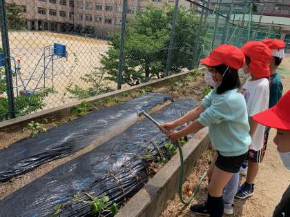 2年生の水やりです。当番の経験がある子どもが今日の当番に水やりの仕方を教えていました。