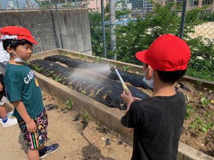 2年生のサツマイモへの水やり。虹ができていました。