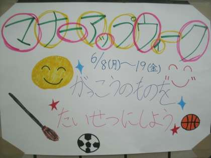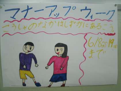 マナーアップウィークは、あいさつだけがめあてではありません。「校舎内の歩行」や「物を大切にすること」についてもポスターを作り、全校児童への啓発をしています。