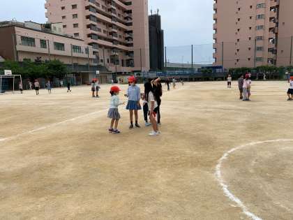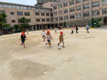 サッカー、バスケットボール、おにごっこ。みんななかよく遊んでいます。