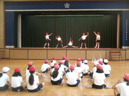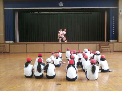 6年生が体育科学習で「リズムダンス」に取り組み、6月18日(木)の第6校時に発表会を行いました。B'zの「ultra soul」に合わせて、自分たちが経験してきた「金塚なわとび体操」や「プール体操」、テレビ等で見たことのある様々な動きを取り入れながらリズムにのって踊っていました。