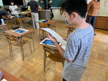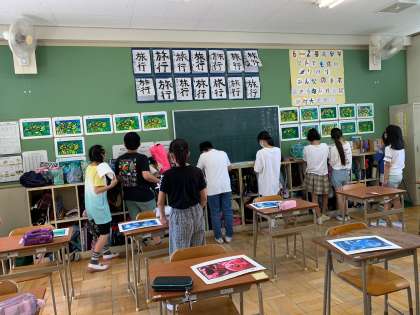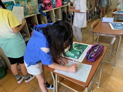 鑑賞の時間です。友だちの作品のいいところを見つけています。