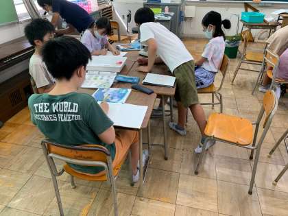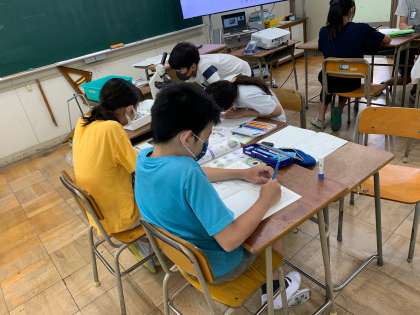 スライドガラスにスポイトで数滴とり、顕微鏡にセットし、グループごとに観察します。オンラインで実験のようすをつないでいます。