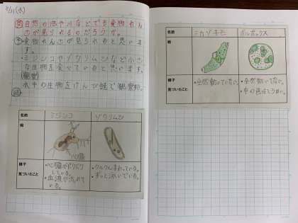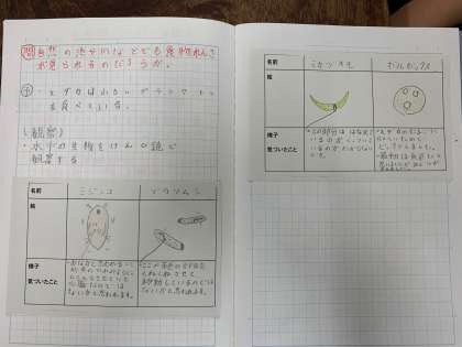 観察したことを、プリントにまとめました。今回は、ゾウリムシ・ミジンコ・ミカヅキモ・ボルボックスを観察することができました。