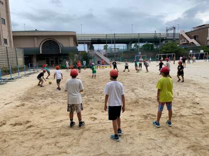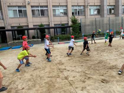 5年生は、3年・6年合同チームとドッジボールです。 必死です。