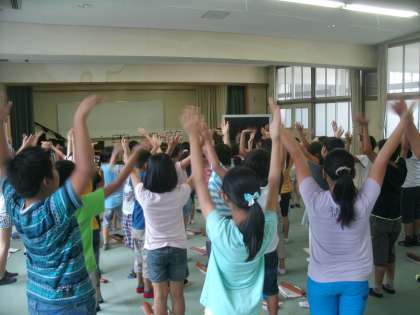 全身を使ったダイナミックな発声練習の後、一緒に合唱したり、互いの合奏を聴き合ったりしました。きれいな歌声と合奏の美しいメロディが多目的室いっぱいに広がりました。