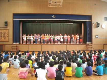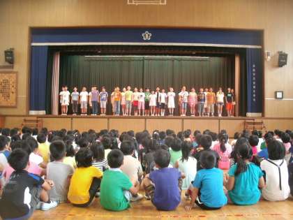 7月9日(木)の児童集会、6年生が国語科・音楽科で学習したことを全校児童の前で発表しました。
