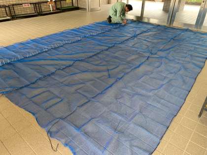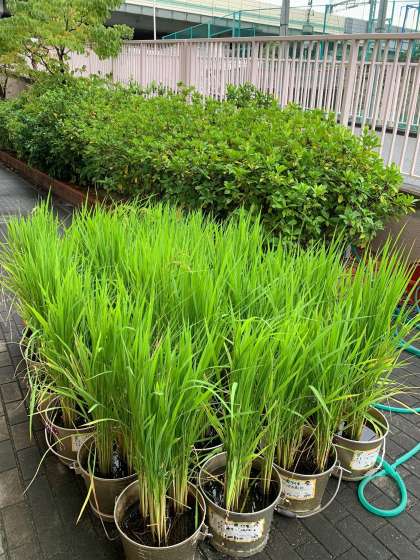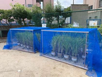 5年生がバケツで稲を育てています。もう少しで稲穂が実りそうです。ここから、雀に食べられないように管理作業員さんが囲いを作ってくれました。
