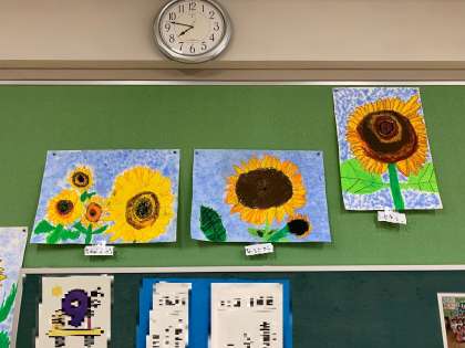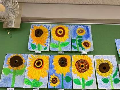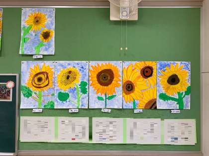 1ねんせいの きょうしつの ひまわりは いまが まんかいです。