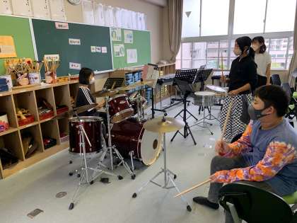 10月5日(水) 放課後 公開日 2022/10/05 更新日 2022/10/05 お知らせ 職員室にリズミカルなドラムの音が聞こえてきました。 合同音楽発表会に向けて6年生が練習していました。 いいね(0)