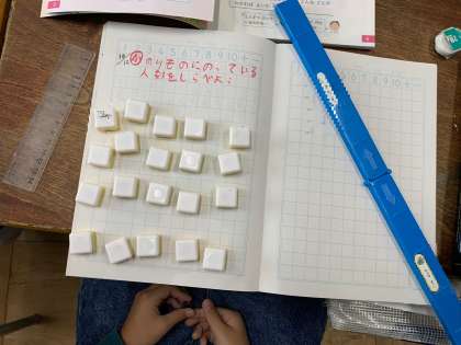 ボート・自転車など、それぞれののりものに、同じ人数がのっていることを、ブロックを使い、たしかめます。