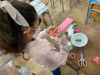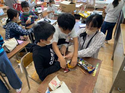 この後、おもちゃランドに向けて、グループでおもちゃを作ります。そして、1年生をしょうたいして、いっしょにあそびます。