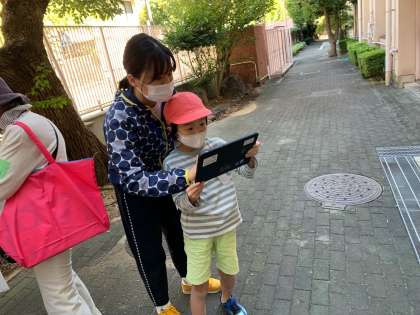 見つけた生き物を袋や入れ物に入れ、教室で交流します。