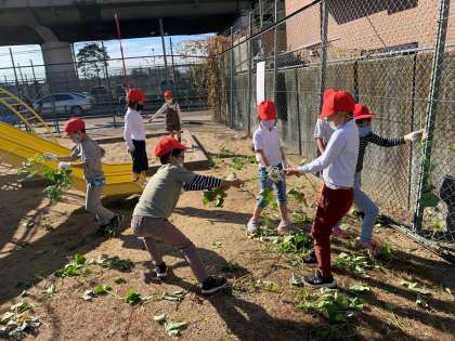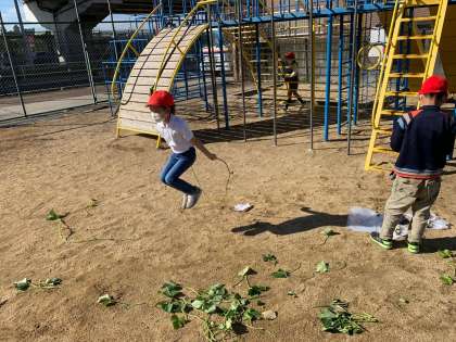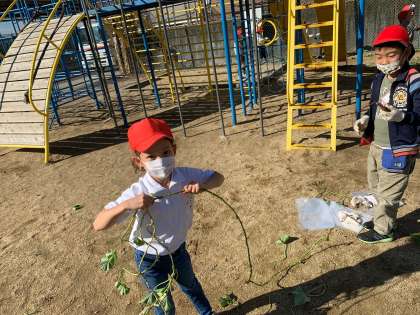 後半もくきやつるをつかった遊び。いろいろと遊びを考えます。