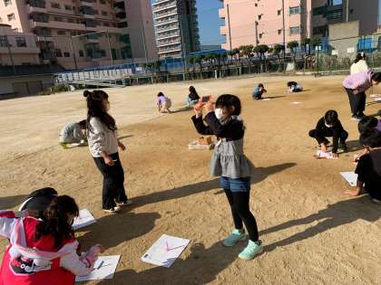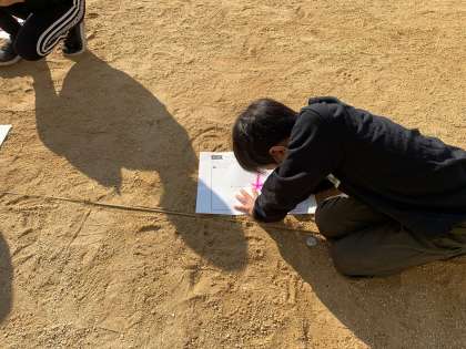 かげと太陽の動きを、記録用紙に記録していきます。