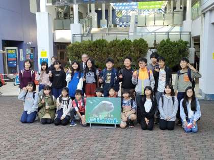 鳥羽水族館の前で記念写真撮影
