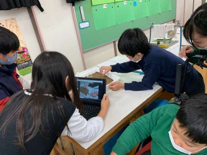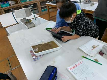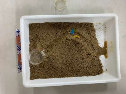 前回は、運動場の砂山で実験しました。今回は、教室で模型を作り、実験します。