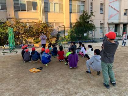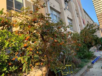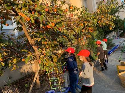 柿がり1 金塚小学校の柿が実りました。今日は、野菜部で柿がりです。