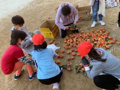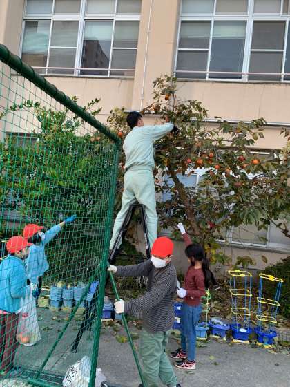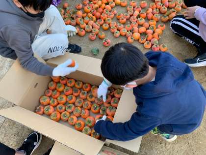 高いところにある柿は、枝ごと管理作業員さんに切ってもらいました。その後、箱詰めします。
