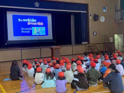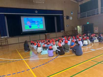 後半の訓練です。 1・2・3年生は、講堂で防災学習です。