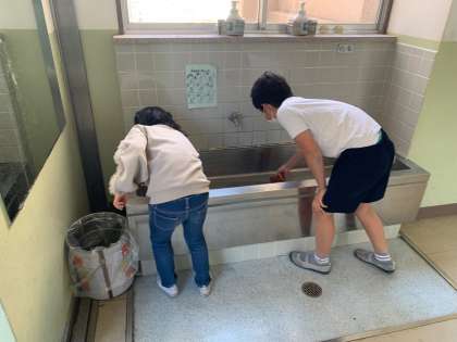 6年生が清掃場所の指示をして、協力して清掃します。