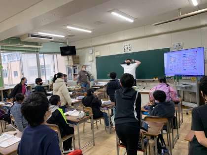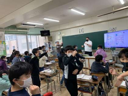 先生たちは、〜ができますかという質問にみんながこたえています。大盛り上がりで学習していました。