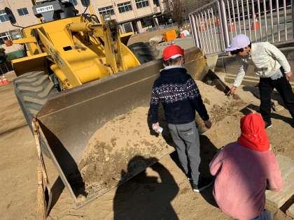 答えは、ホイールローダーです。土を持ち上げることに使用します。ちなみに、ブルドーザーは、タイヤの部分がキャタピラーで、整地をするときに使用するそうです。
