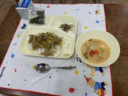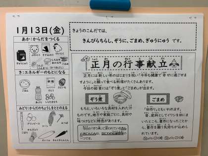 今日は、正月の行事献立です。 ぞう煮は白味噌で、子どもにちょうどいい味付けでした。