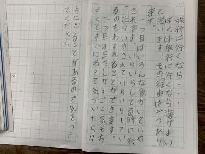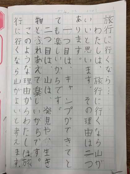 1月18日(水) 学習のようす 3年 国語 公開日 2023/01/18 更新日 2023/01/18 お知らせ 自分の考えをつたえよう 旅に行くなら、山がいいか、海がいいか、理由を考えて書いています。 いいね(0)