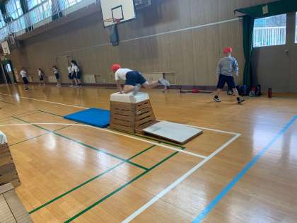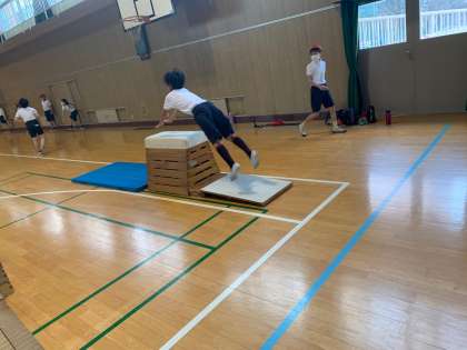 助走の勢いがつきすぎないように工夫しています。子どもがめあてにそって練習できるように場の工夫をいろいろしています。