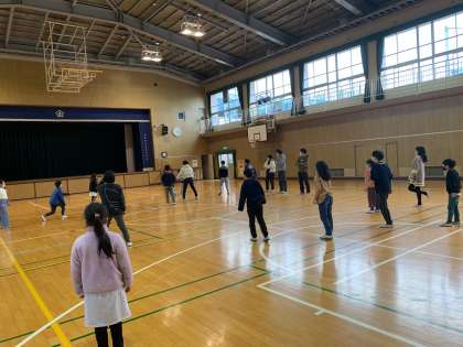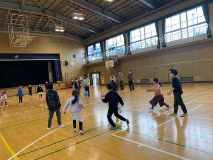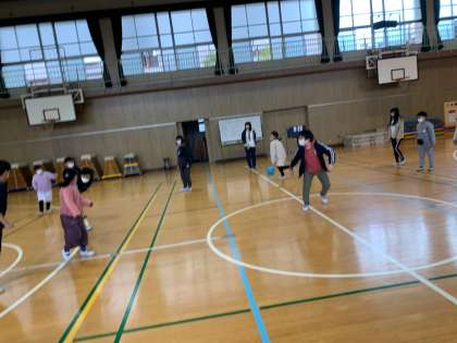 青グループ1 今日は、ドッジボールです。1班対2班でゲームです。