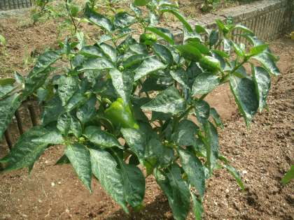 ナスの隣では、ピーマンも実をつけていました。きれいな緑色が朝日に輝いています。