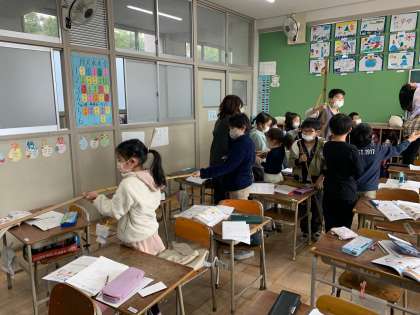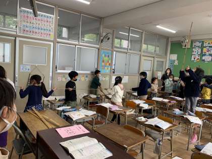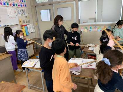 みんなで協力して、教室のたての長さをはかっています。1mものさし8本とちょっとでした。