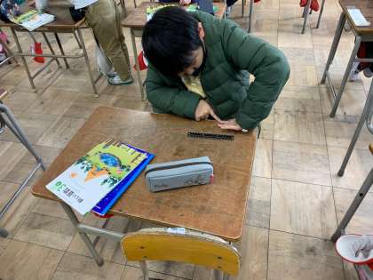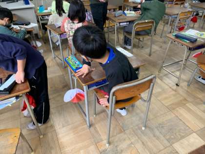 倍の計算1 「あて」「つか」を使い、机の横の長さをはかりとっています。