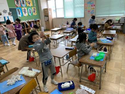 みんな楽しく教室で遊んでいます。雨の日の定番は、ねんどです。