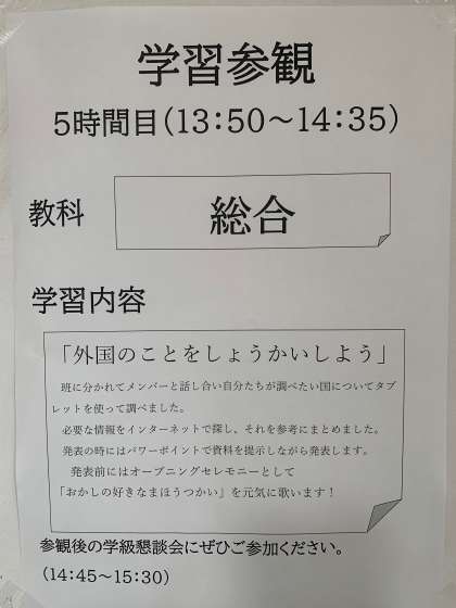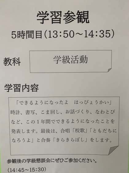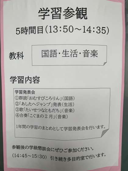 2月15日(水) 学習参観の予定 1・2・3年 公開日 2023/02/15 更新日 2023/02/15 お知らせ 上段 1年 1年1組教室 中段 2年 多目的室 下段 3年 3年1組教室 いいね(0)