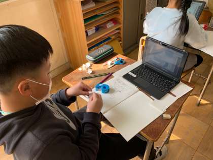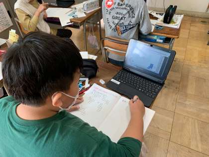 タブレットの図で立方体が完成するか、面の数に注意しながら確かめています。