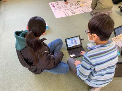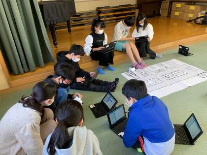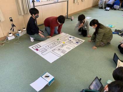最後の理科の授業は、プログラミングです。コーディーロッキーを地図上で金塚小学校からあべのハルカスまで走らせます。