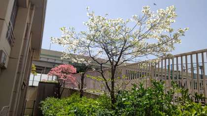 講堂横に植えられているハナミズキが満開です。紅白の花がきれいです。