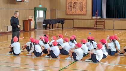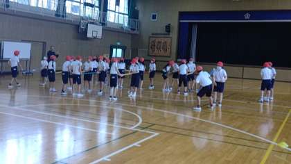 体育の学習です。雨だったので体育館での学習です。柔軟性や筋力を高めるための運動をしました。金塚小の子どもたちは、握力や柔軟性に課題があります。体育の学習だけでなく、普段の学校生活の中でもできることを教わりました。