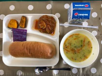 ・コッペパン ・ブルーベリージャム ・にこみハンバーグ ・コーンとキャベツのスープ