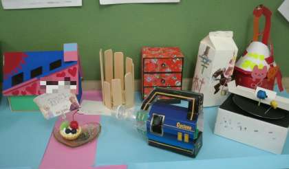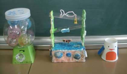 図工室に集まった図画作品だけでなく、各教室には子どもたちが夏休み中に制作した工作の作品が数多く展示されています。図画の作品同様、こちらも力作ぞろいです。